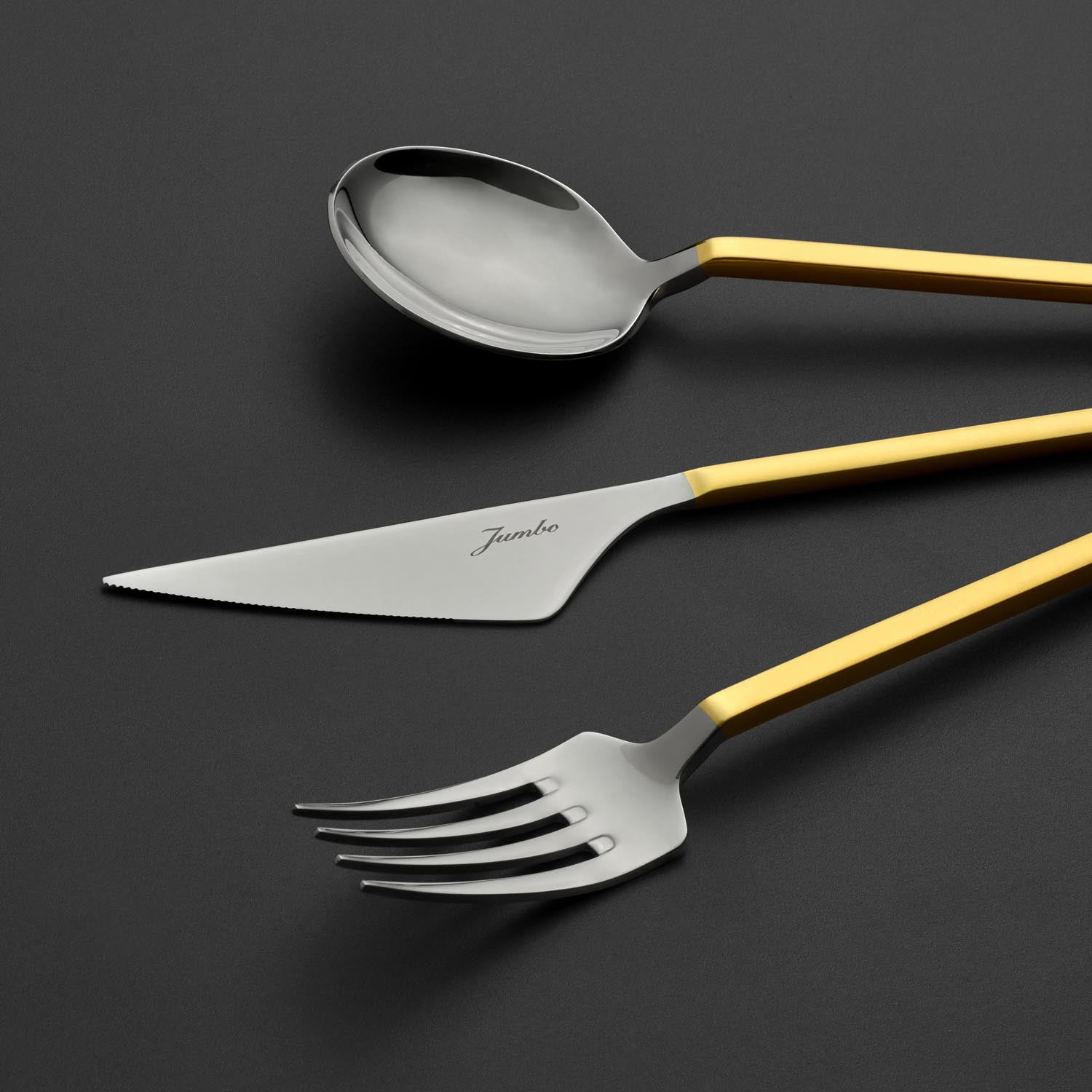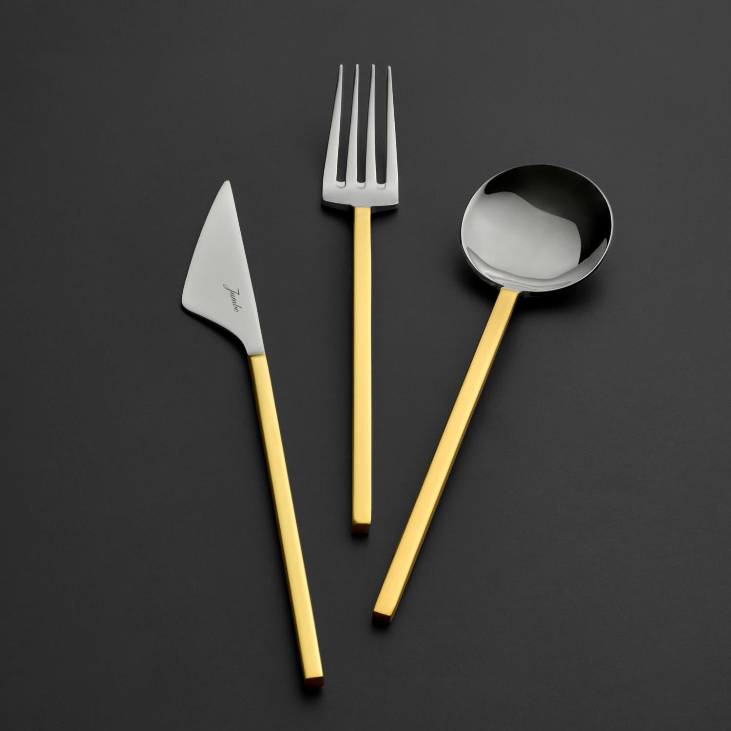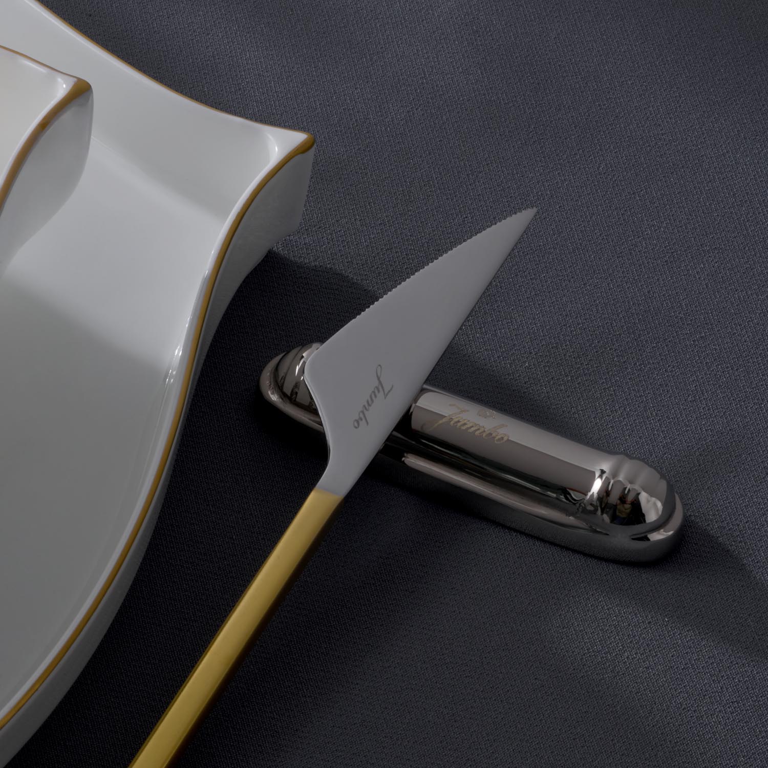 En modern sofraların baş tacı olmaya şimdiden aday bu takım, ilk bakışta göze çarpan zarafeti ile bir başka eşi benzeri olmadığını kanıtlıyor. Jumbo 9100 mat altın çatal kaşık bıçak takımı, klasikleşmiş ve geleneksel çatal kaşık bıçak takımları tasarımlarına adeta meydan okuyor. Göz alıcı mat gold ve silver tonlarında dizayn edilen bu olağandışı tasarım, sofralara yerleştirildiği andan itibaren tüm konukları kendisine hayran bırakmayı garantiliyor. Üstelik form olarak kareli hatlara sahip olduğu için en modern yemek takımlarıyla harika bir ahenk oluşturabiliyor. Daha fazla çatal kaşık bıçak takımı modelimizi yakından incelemek için Çatal Kaşık Bıçak kategorimizi ziyaret edebilirsiniz.