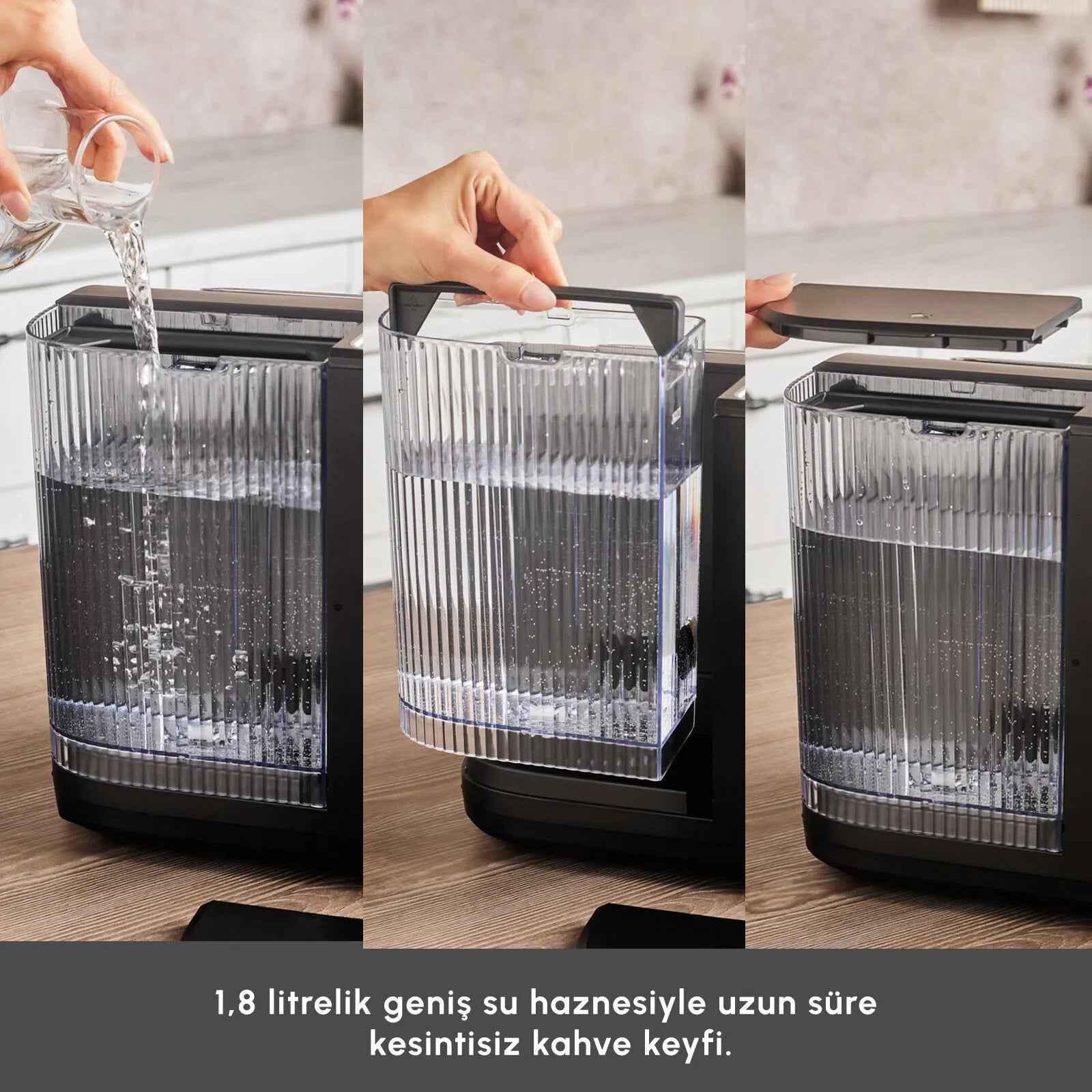 1,8 litrelik su haznesi, yoğun tüketim dönemlerinde dahi uzun süre su ekleme ihtiyacını azaltan güçlü bir kapasite sundu. Böylece gün içinde ardışık espresso, sütlü kahve ve Türk kahvesi hazırlıkları sorunsuz biçimde sürdürüldü.