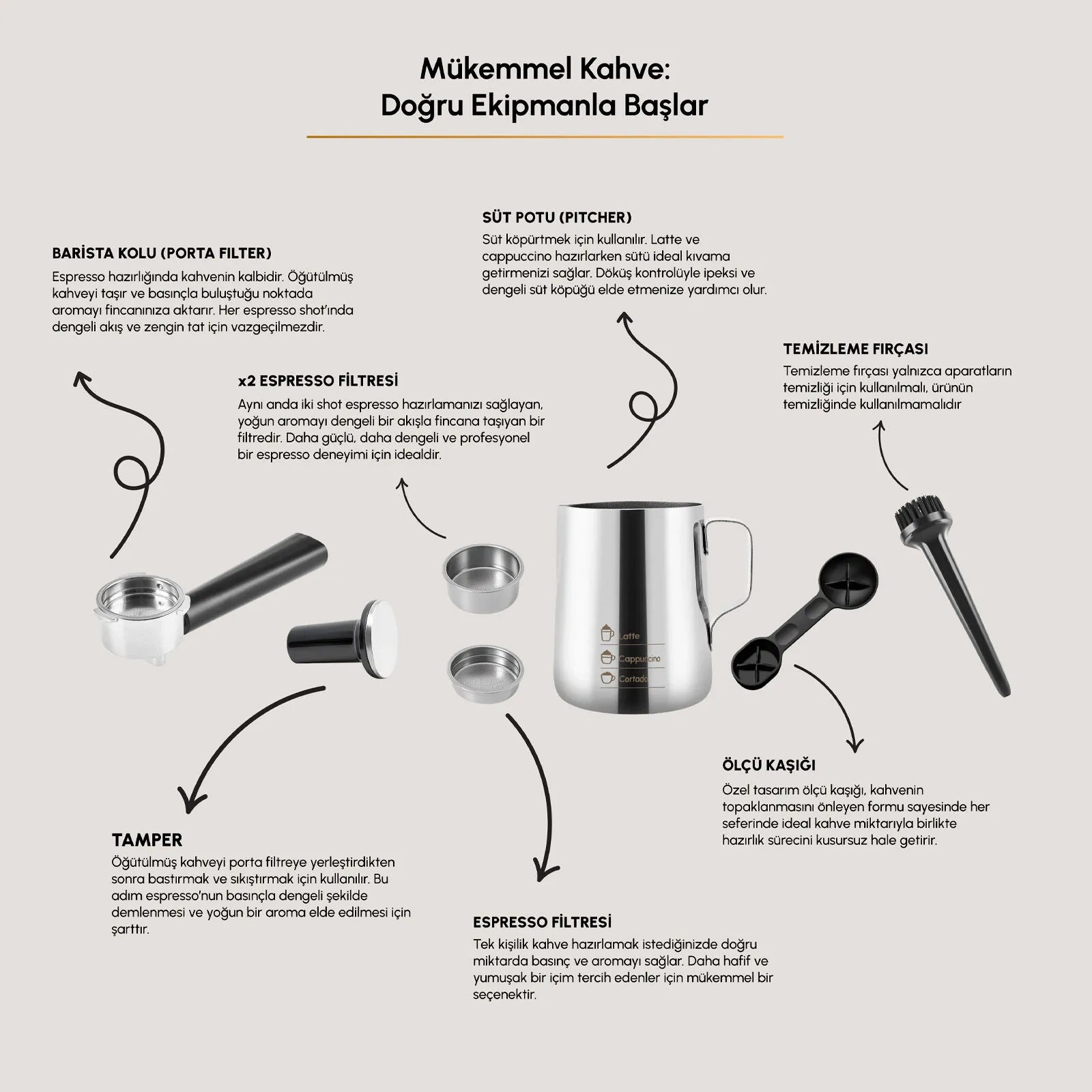 Evet. Kutu içeriğinde tamper, ölçü kaşığı, süt potu (pitcher), porta filtre, cezve temizleme fırçası ve gerekli tüm aksesuarlar bulunmaktadır.