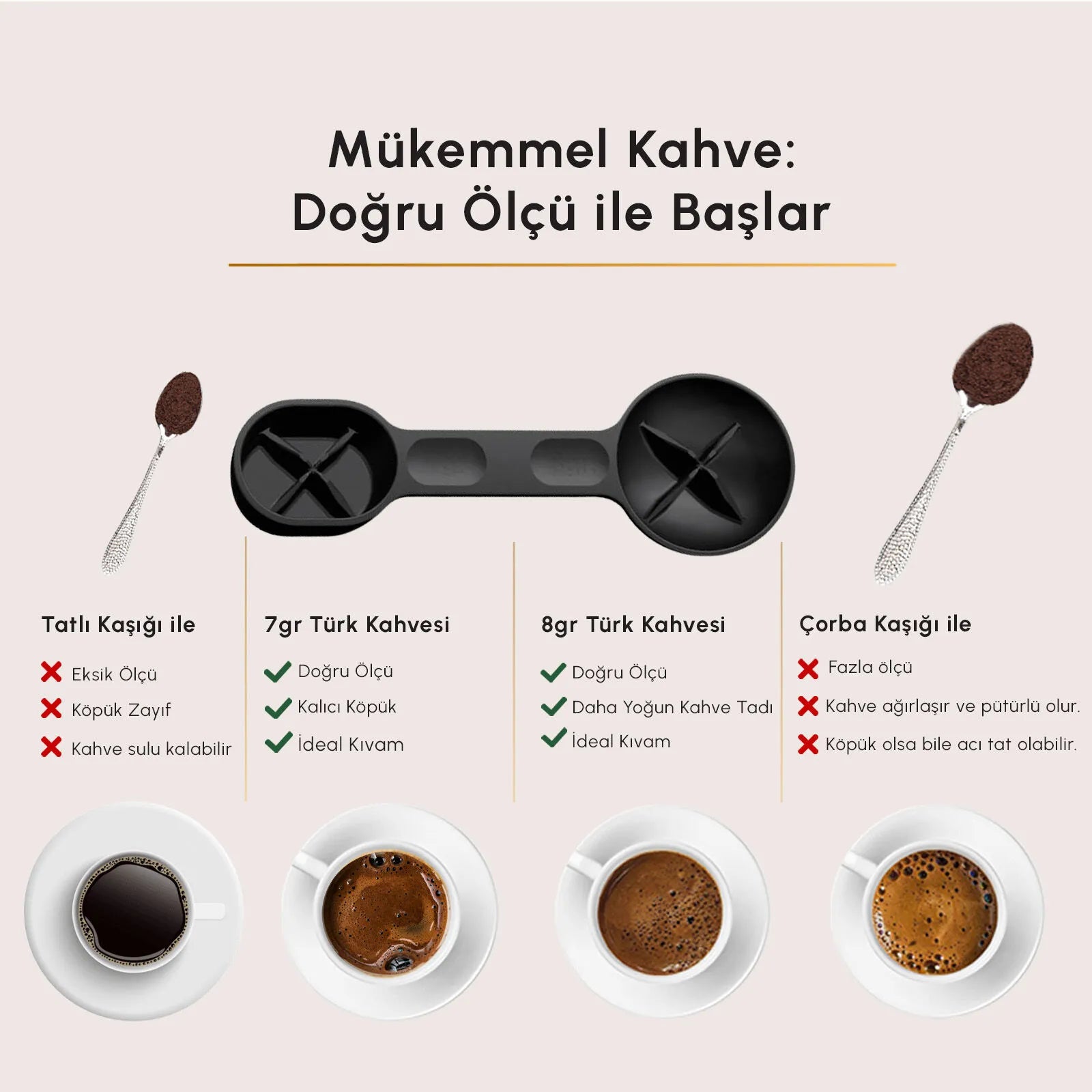 Ölçü kaşığı, kahvenin doğru miktarda ve topaklanma olmadan alınmasını sağlayacak özel bir formda tasarlandı. Temizleme fırçası ise cezve ve porta filtrede oluşan kalıntıların kolay biçimde temizlenmesi için kutu içeriğine dahil edildi.