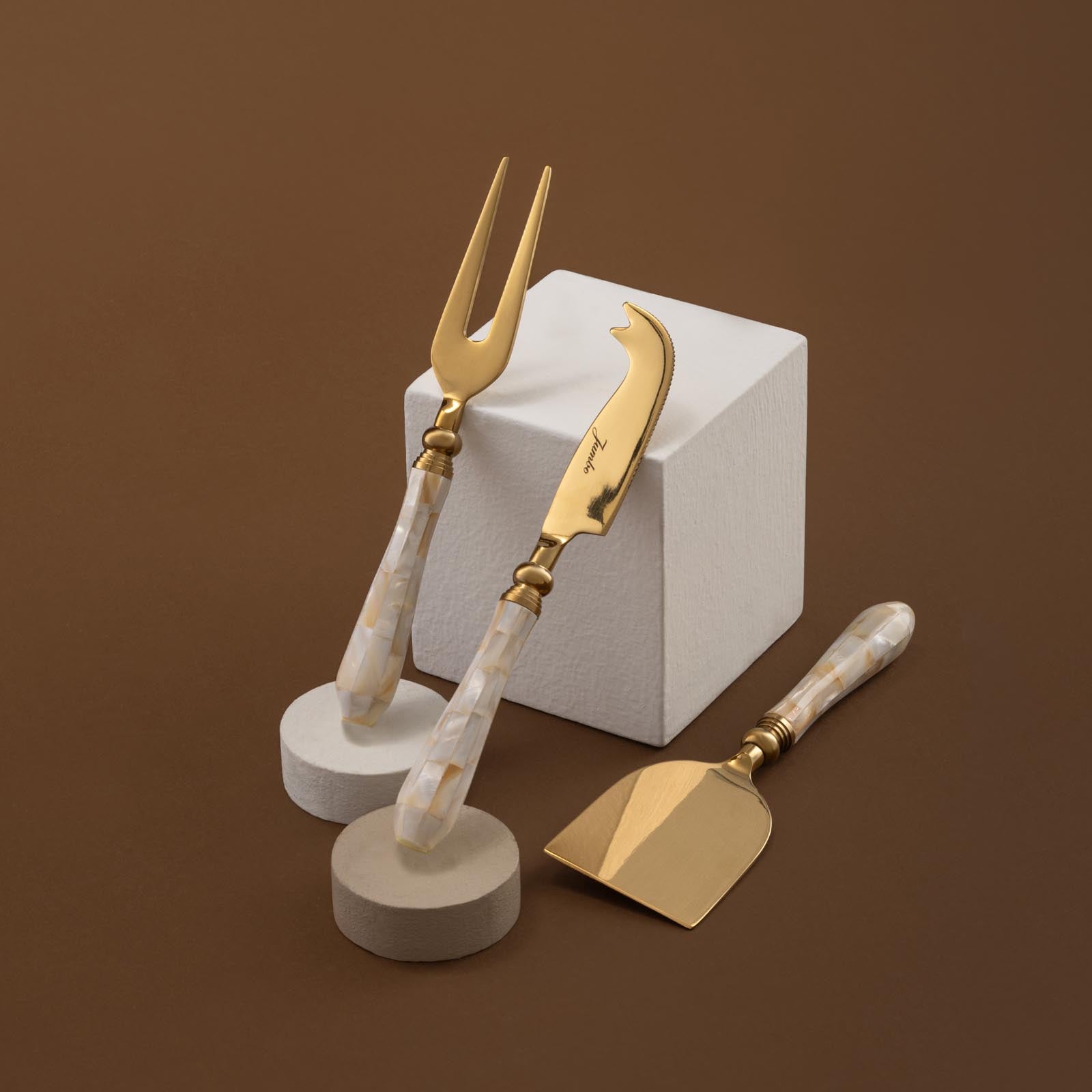 Marmo 3'lü Peynir Servis Seti, peynir ve şarküteri sunumlarınızı zarif bir şekilde taçlandırır. Paslanmaz çelik malzeme, dayanıklılığı ve parlaklığıyla şıklık sunarken, gerçek sedeften yapılan tutma yerleri, estetik bir dokunuş ekler. 17 cm uzunluğu, peynirlerinizi rahatça kesip servis edebileceğiniz mükemmel boyut.