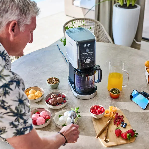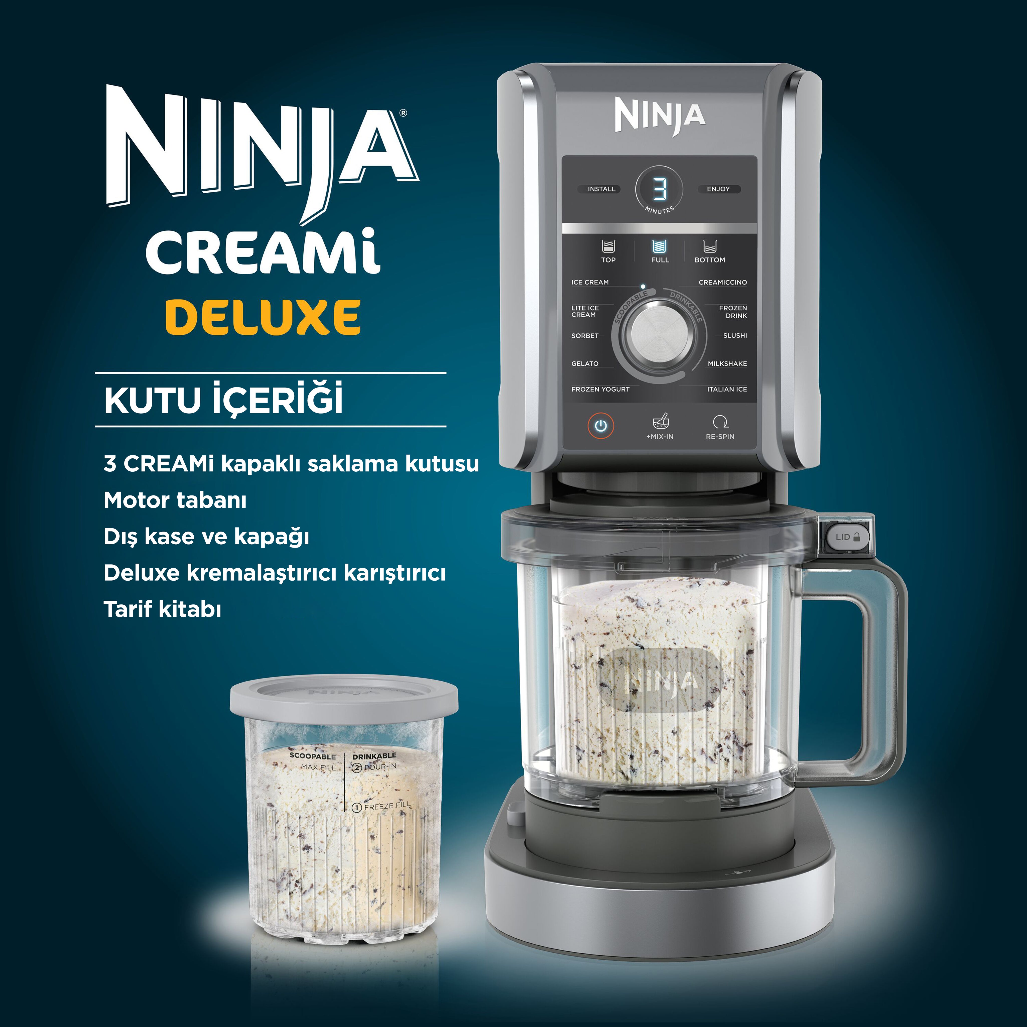 Ninja CREAMi Deluxe ile neredeyse her şeyi dondurmaya ve çok daha fazlasına dönüştürebilirsiniz. Dondurma, sorbe, gelato gibi CREAMi klasiklerini ve karışım başyapıtlarını yapın. Ve şimdi, evde ferahlatıcı bir meyveli slush, kahve frappe, dondurulmuş yoğurt veya dondurulmuş bir içecek yapın.